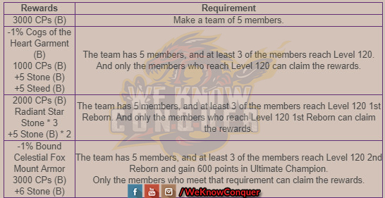 4 : لما 3 من التيم يوصله مستوي 120 وسكند وهياخد 600 نقطة من التشامبيون هياخده ماونت دمج Celestial Fox Mount Armor و 3000 سى بى اس باوند واستون +6