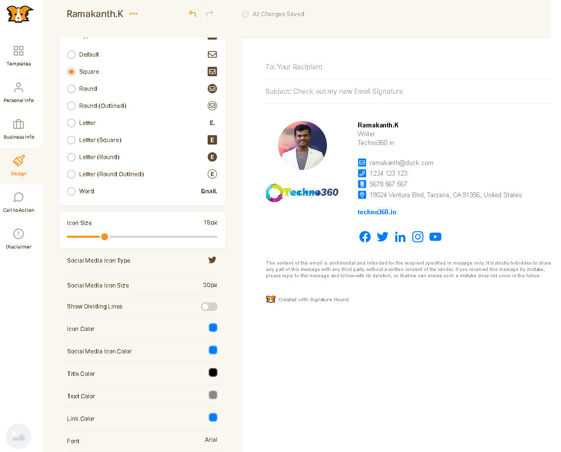 يمكنك ضبط حجم شعارك وأيقونات الوسائط الاجتماعية ، وإضافة خطوط فاصلة ، وتغيير لون النص ليتناسب مع نظام ألوان شركتك ، وغير ذلك الكثير باستخدام تطبيق الويب هذا.