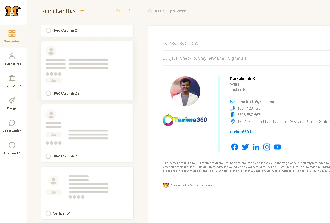 املأ النموذج برقم هاتفك وعنوان بريدك الإلكتروني وعنوانك الفعلي ومقابض الوسائط الاجتماعية وما إلى ذلك. ليس هذا فقط ، ولكن يمكنك تخصيص توقيعك عن طريق تحميل صورة لنفسك و / أو شعار شركتك.
