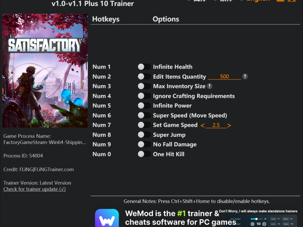 Satisfactory Trainer 10 Options · Game Version: v1.0-v1.1+
