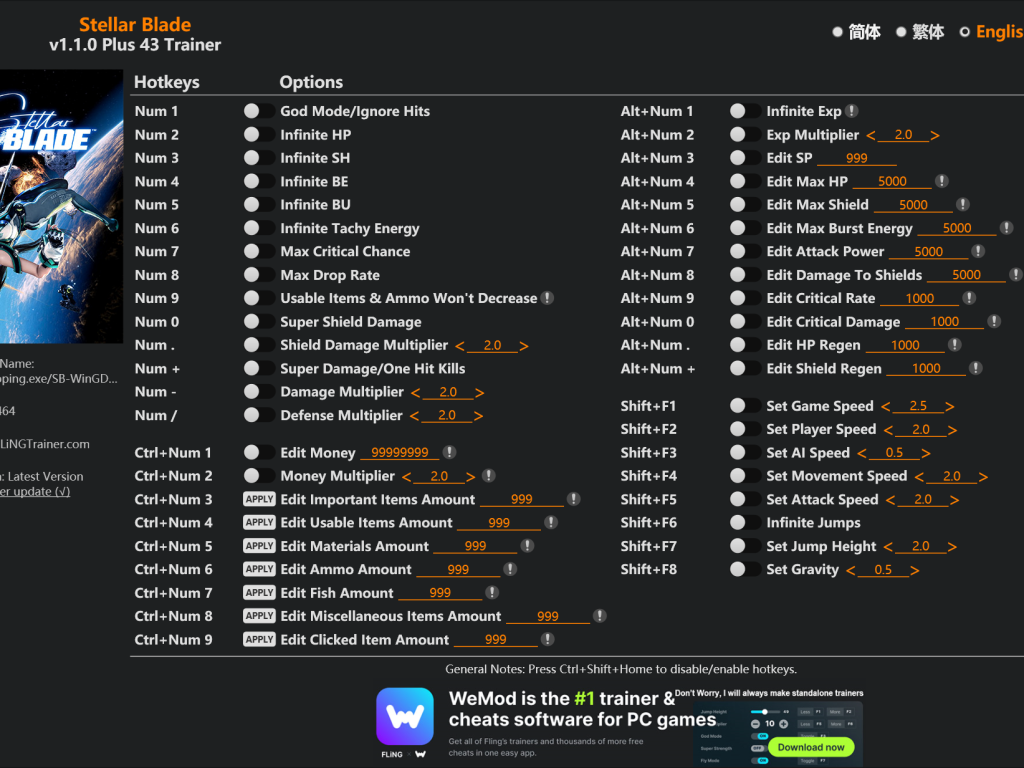Stellar Blade Trainer 43 Options · Game Version: v1.1.0+
