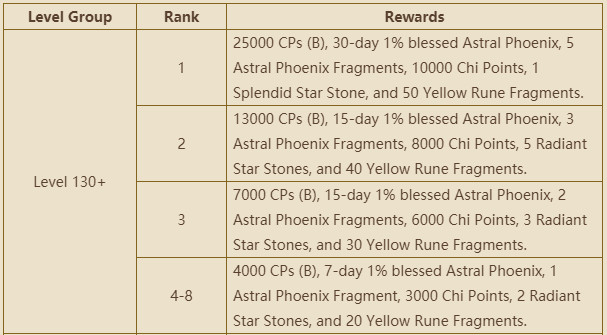 25000 CPs (B), 30-day 1% blessed Astral Phoenix, 5 Astral Phoenix Fragments, 10000 Chi Points, 1 Splendid Star Stone, and 50 Yellow Rune Fragments.