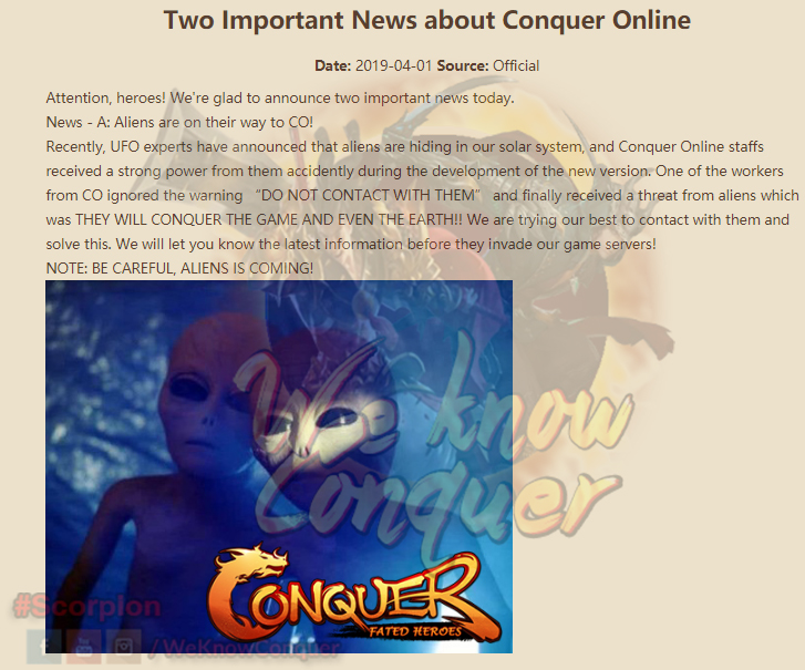 في الآونة الأخيرة ، أعلن خبراء UFO أن الفضائيين يختبئون في نظامنا الشمسي ، وحصل موظفو Conquer Online على قوة قوية منهم بطريق الخطأ أثناء تطوير الإصدار الجديد. تجاهل أحد العمال من شركة CO التحذير “لا تتصل بهم” وتلقى أخيرًا تهديدًا من الفضائيين الذين كانوا سيهزمون اللعبة وحتى الأرض !! نحن نبذل قصارى جهدنا للاتصال بهم وحل هذا. سنخبرك بأحدث المعلومات قبل أن تغزو خوادم الألعاب الخاصة بنا!