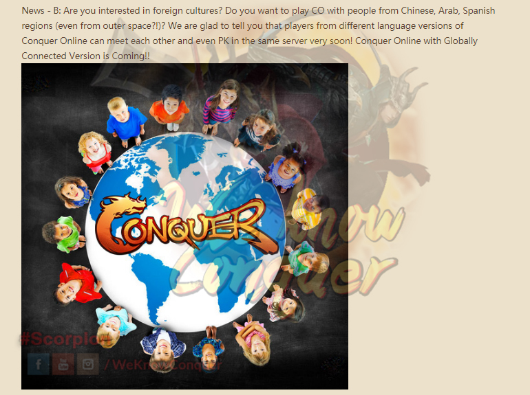 أخبار – ب: هل أنت مهتم بالثقافات الأجنبية؟ هل تريد أن تلعب CO مع أشخاص من المناطق الصينية والعربية والإسبانية (حتى من الفضاء الخارجي ؟!)؟ يسعدنا إخبارك أن اللاعبين من إصدارات بلغات مختلفة من Conquer Online يمكنهم مقابلة بعضهم البعض وحتى PK في نفس الخادم قريبًا! قهر على الإنترنت مع إصدار متصل عالميا قادم !!