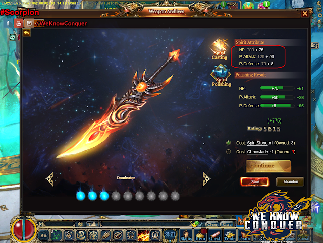 عندما يصل Weapon Spirit إلى 3 نجوم ، يتم إلغاء قفل Spirit Polish ، يمكنك إضافة مبلغ إضافي في HP و P-Attack و P-Defense في البولندية ، وستتم إضافة نتيجة التلميع إلى سمات Spirit الأساسية. في كل عملية تلميع ، تكون النتيجة عشوائية ، وقد تكون النتيجة أسوأ من سماتك الحالية ، يرجى التفكير مرتين قبل حفظ النتيجة.