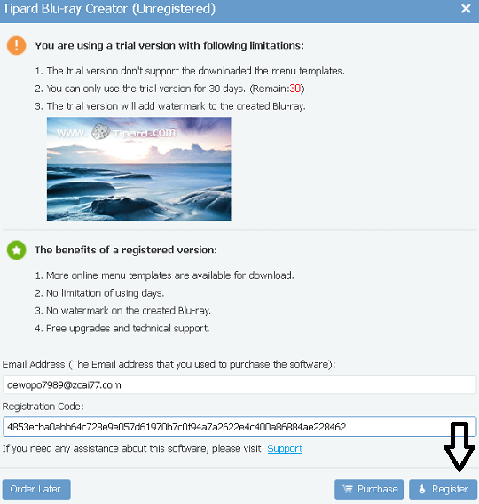 ستتلقى رسالة بريد إلكتروني من tipard ( registration@tipard.com ) في صندوق الوارد الخاص بك. يقدم هذا البريد الإلكتروني رمز الترخيص أو تفاصيل التنشيط.