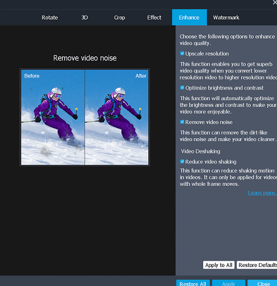 يمكنك رفع مستوى دقة الفيديو الخاص بك بنقرة واحدة. يضبط السطوع والتباين تلقائيًا لتفتيح الفيديو المسجل الداكن. يستقر الفيديو المهتز.