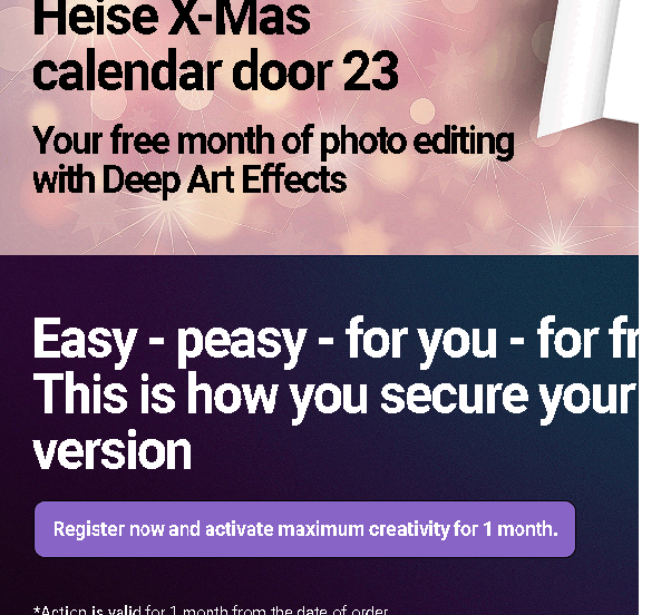 اليوم ، يمنح Heise.de محرر الصور هذا الذي يعمل بالذكاء الاصطناعي مجانًا لمدة شهر واحد (ترخيص لمدة شهر واحد). هذا العرض جيد فقط لهذا اليوم.