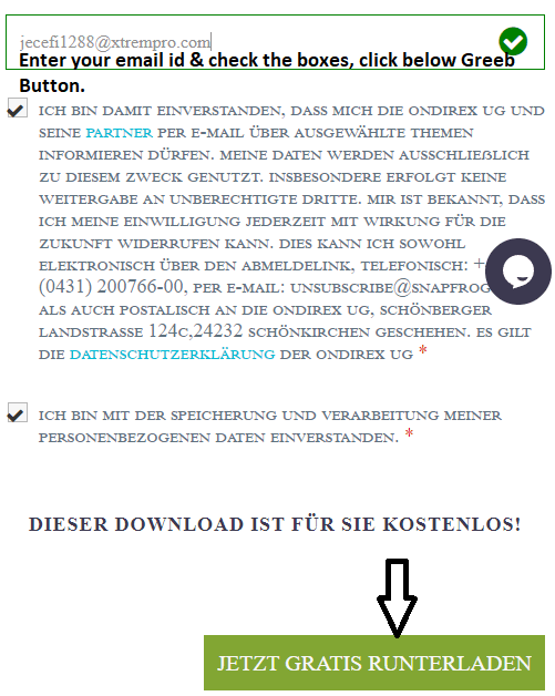 أدخل عنوان بريدك الإلكتروني ، ووافق على الشروط ، وانقر على “تنزيل الآن” (Jetz Gratis Runterlanden).