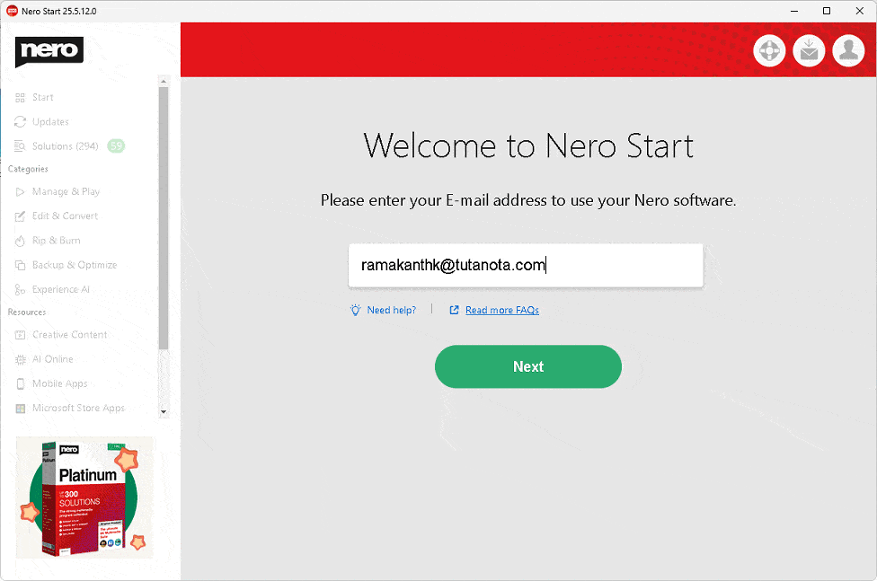 عندما ترى شاشة مثل لقطة الشاشة الموضحة أدناه تقول “مرحبًا”. أدخل عنوان بريدك الإلكتروني وانقر على “التالي” للتسجيل للحصول على حساب Nero.