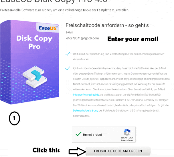 أدخل عنوان بريدك الإلكتروني ، وحدد جميع المربعات ، واملأ reCaptcha ، وانقر فوق الزر “Freischaltcode anfordern”.