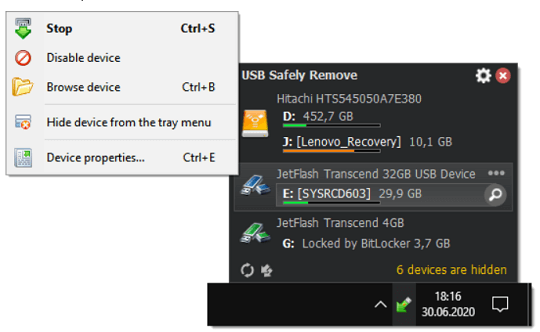ينقذك USB Safely Remove من هذه المشاكل ويقدم قائمة إيقاف أصلية ومتعددة الوظائف، والتي تعرض أسماء الأجهزة الفعلية مع الرموز. باستخدام هذه القائمة، يمكنك العثور على جهاز وإيقافه في لمح البصر!