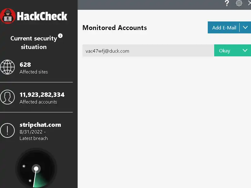 يوفر لك HackCheck معلومات حول عناوين بريدك الإلكتروني وآخر حوادث القرصنة. في النافذة الرئيسية، يمكنك الاطلاع على تفاصيل حول الاختراق الأخير، والعدد الإجمالي لصفحات الويب التي تم اختراقها، والعدد الإجمالي لهجمات البريد الإلكتروني التي تم اختراقها. من السهل التعرف على أحدث خدمة عبر الإنترنت تم اختراقها.