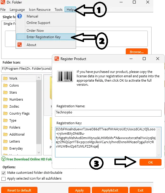 في القائمة الرئيسية للتطبيق، انقر فوق “مساعدة” ثم انقر فوق “إدخال مفتاح التسجيل”.